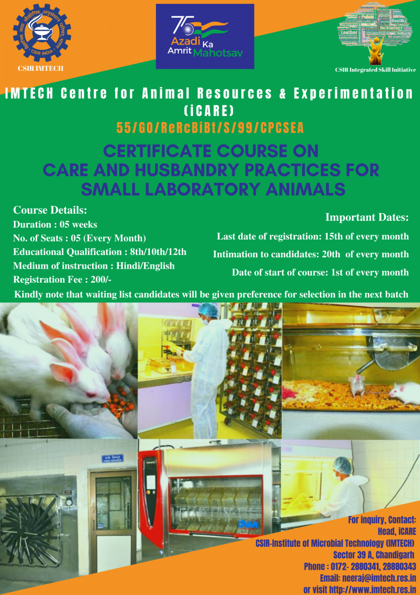 Applications are invited from eligible citizens of India for 5-week training program under CSIR-IMTECH Skill Development program on “Care and Husbandry Practices for Small Laboratory Animals”