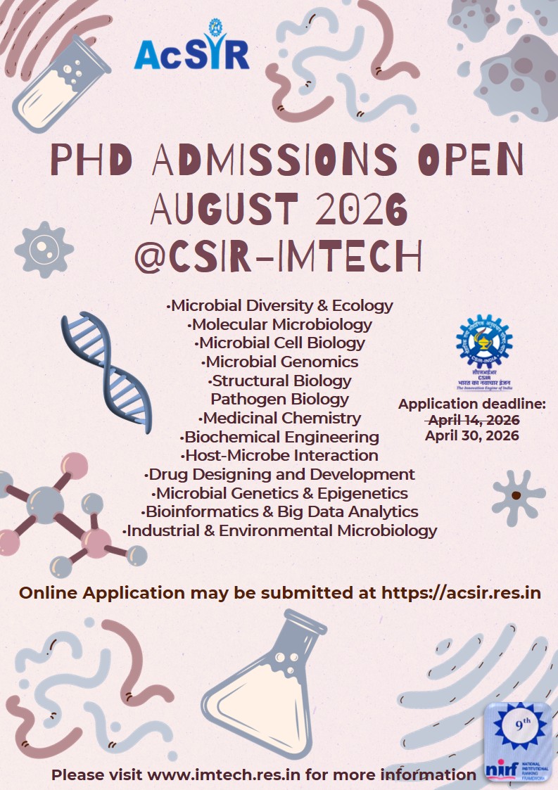 CSIR-Institute of Microbial Technology (CSIR-IMTECH), invites applications from exceptionally motivated candidates for pursuing doctoral research in Academy of Scientific and Innovative Research (AcSIR) at CSIR-IMTECH. CSIR-IMTECH is a multidisciplinary institute with state of the art research facilities, and faculty with research interests in the following frontier areas of modern microbiology - Molecular Microbiology, Microbial Genetics & Epigenetics, Microbial Genomics, Host-Microbe Interaction, Pathogen Biology, Cellular Trafficking, Microbial Cell Biology, Structural Biology, Drug Designing and Development, Industrial & Environmental Microbiology, Genetic Engineering, Microbial Diversity & Ecology, Bioinformatics & Big Data Analytics, Biochemical Engineering and Medicinal Chemistry. (Visit website http://www.imtech.res.in for information on different research areas and faculty profile).