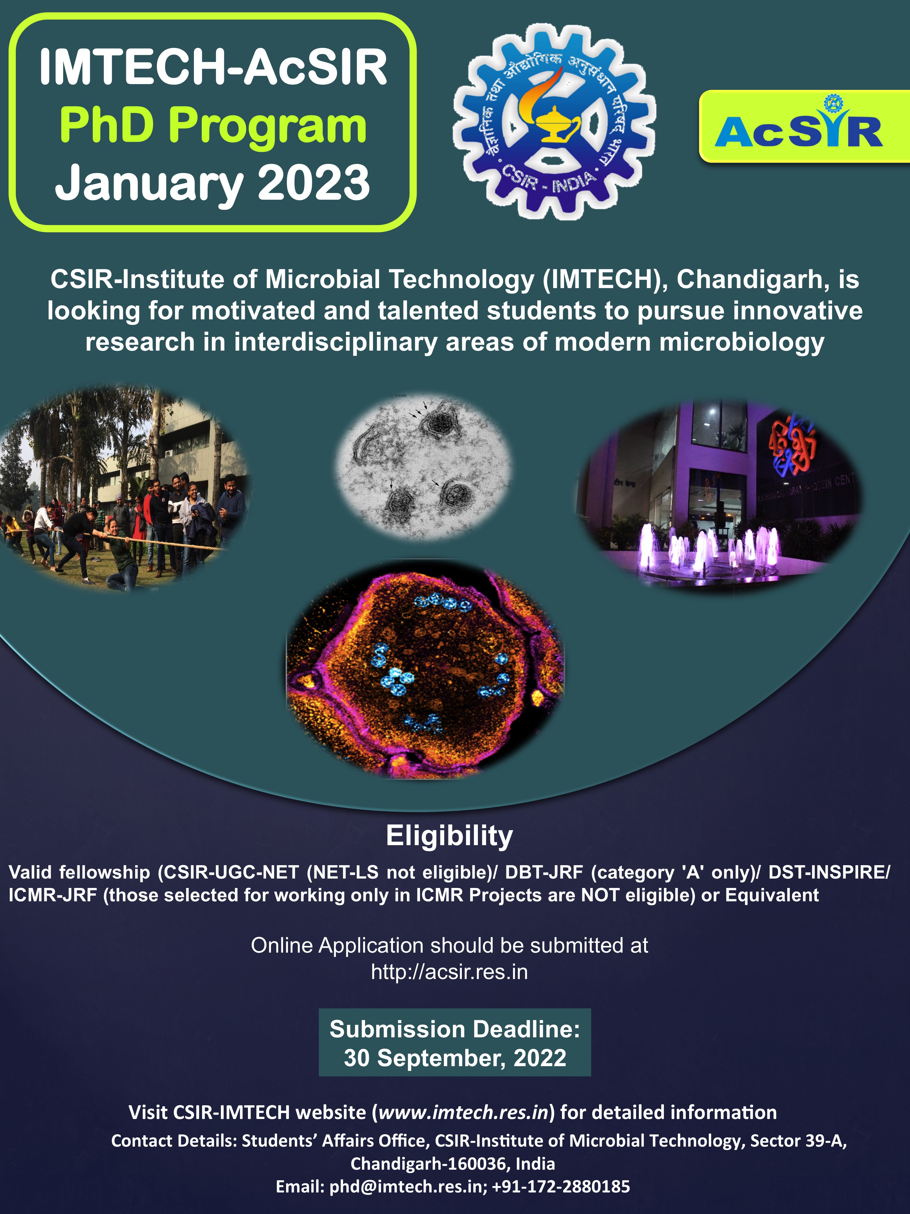 CSIR-Institute of Microbial Technology (CSIR-IMTECH), invites exceptionally motivated candidates for pursuing doctoral research at CSIR-IMTECH under the aegis of PhD program being jointly run by CSIR-IMTECH and Academy of Scientific & Innovative Research (AcSIR), New Delhi.